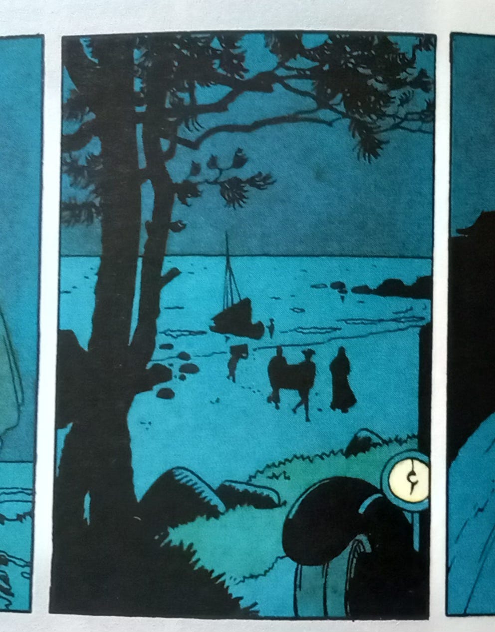 Thinking again about the portrayal of varying lengths of time in a single comics panel, this is a highly efficient storytelling image. The preceding page shows Tintin and Snowy being kidnapped, some boxes being left in the sea by a coast, and a box being unloaded from a small boat. This image tells us that the box is being carried by several people to their waiting car. You don’t see the mysterious figures pick it up, carry it to the car, or put it in the car - but you know it’s happened through that snapshot in time. And the context makes it likely it’s the kidnapped heroes who are being transported, but we’re still not 100% sure of what’s going on. And the action is in silhouette at night, adding to the shady nature of the event, the mystery and suspense. All this in a very small image. There are plenty more detailed, colourful, characterful and larger images in the book, but I was just struck by its efficiency and effectiveness. Masterful storytelling.